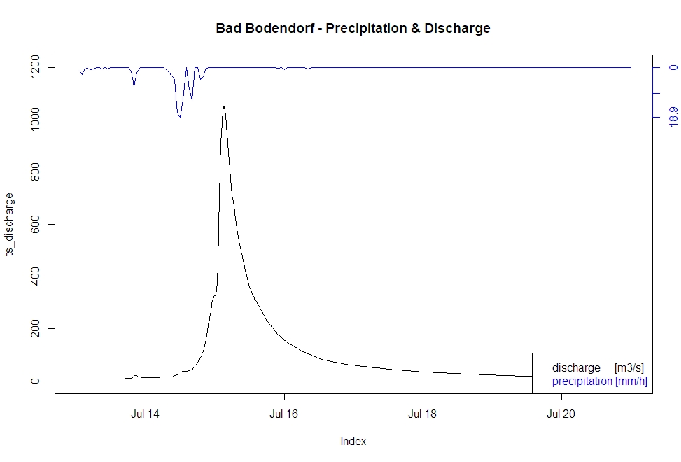 During the event, the several flow gages recording the discharge (water level) were damaged. Measured water levels were partial beyond the range of existing rating curves. Due to these reasone, the water level/discharge register were not complete, and the peak discharge were not measured. However, using hydrological tools and modelization, a peak discharge between 800-1000 m3/s at Bad Bodendorf station was simulated.